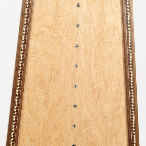 Eine elegante schlichte Verzierung sind Zierleisten in den Randleisten der Harfe - in Holz oder Perlmutt.