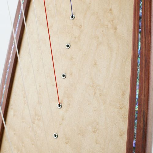 Eine elegante schlichte Verzierung sind Zierleisten in den Randleisten der Harfe - in Holz oder Perlmutt.