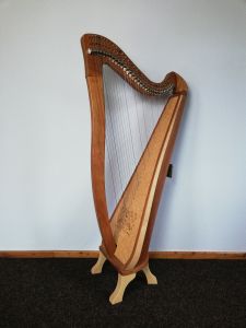 Die Harfe aus unserem eigenem Hause wurde aus Kirschholz gefertigt. Diese Ausführung ist eine von wenigen mit einem breitem Resonanzkörper, welcher für ein größeres Klangvolumen sorgen soll. Besaitung: Carbon | Seriennummer: KO1659KI