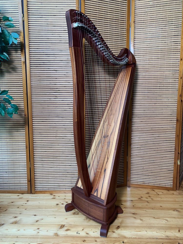 Die Koralin mit einer wunderschönen Sonderklangdecke aus indischem Apfelbaum ist mit Karbonsaiten bespannt. Der Korpus besteht aus Mahagoniholz. Mit dem montierten Sockel ist die Harfe etwas größer als die Koralin in der Standardausführung. Vor allem gut geeignet für Kinder & Jugendliche, aber auch Erwachsene können diese Harfe spielen.