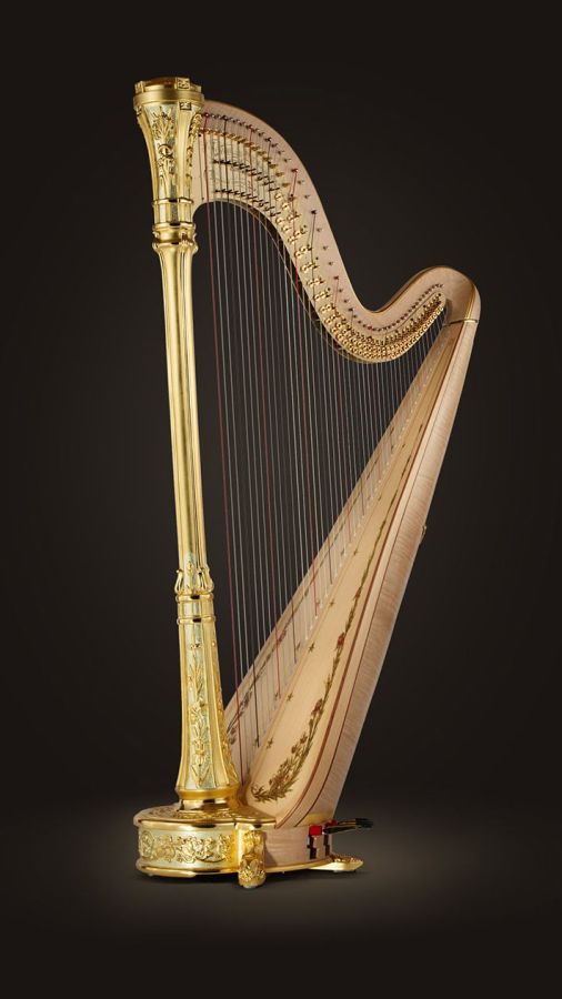 Eine romantische Harfe, im Art Nouveau Design. Weiche florale Dekoration auf der Klangdecke, handgeschnitzte Verzierungen der Ahornsäule. Bei der Version GOLD sind die Schnitzereien mit 23 Karat Blattgold vergoldet.