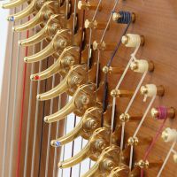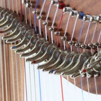Wir haben unsere eigenen performanten "rollenden" Halbtonklappen entwickelt. Ein kleines Rädchen rollt über die Saiten, kann exakt auf das Kaliber der Saite abgestimmt werden und erlaubt ein leichtes, schonendes und exaktes Umstellen der Halbtöne. Die Kennzeichnung von C und F Klappen wird durch dezente - aber gut sichtbare - hübsche farbige Steinchen erreicht.
