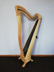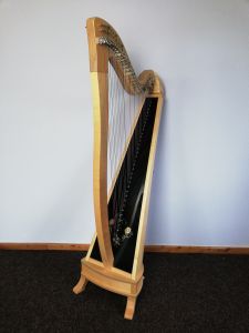 Eine der letzten Harfen des Modells Perle aus unserem Haus. Die Harfe wurde aus Ahornholz gefertigt und mit einer besonderen, schwarz lackierten Klangdecke versehen. Besaitung: Carbon | Seriennummer: P1074AH