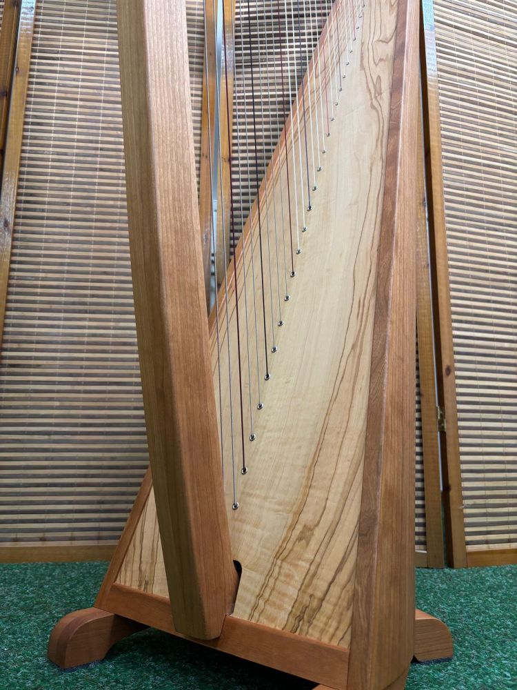 Diese Azurit aus Kirschholz mit einer wunderschönen Sonderklangdecke aus Olivenbaum ist nicht nur ein echter Hingucker, sondern hat auch einen unglaublich schönen Klang. Am Kopf der Harfe wurde eine runde Vertiefung gefräst, so dass Sie sich noch für eine Zierrosette entscheiden können, die von uns eingesetzt wird.