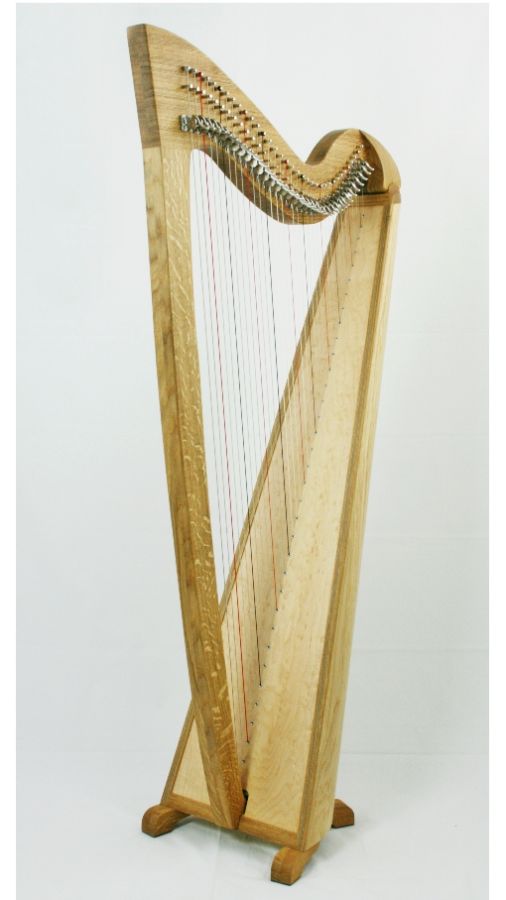 eine ganz schliche Harfe in Eiche - die interessante Holzmaserung der Säule macht sie auch ohne weitere Verzierungen einzigartig.