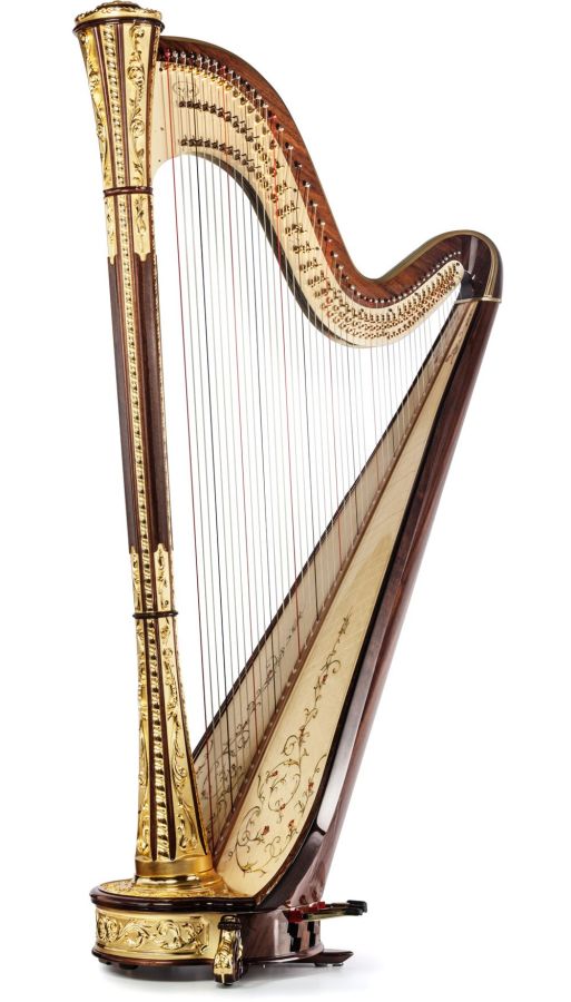 Der Traum aller Harfenspieler: diese Instrument ist verziert mit Blättern aus 23 karätigem Gold. Die perfekte Ästhetik unterstreicht dabei den vollen und energischen Klang - perfekt für Solisten udndOrchester die damit ein weltweites Publikum verzaubern möchten.